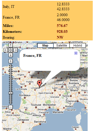 3. לחץ בשנית על Get the Distance ולפניך יופיע המרחק המדוייק בין איטליה לצרפת ומיקום היעדים על המפה,